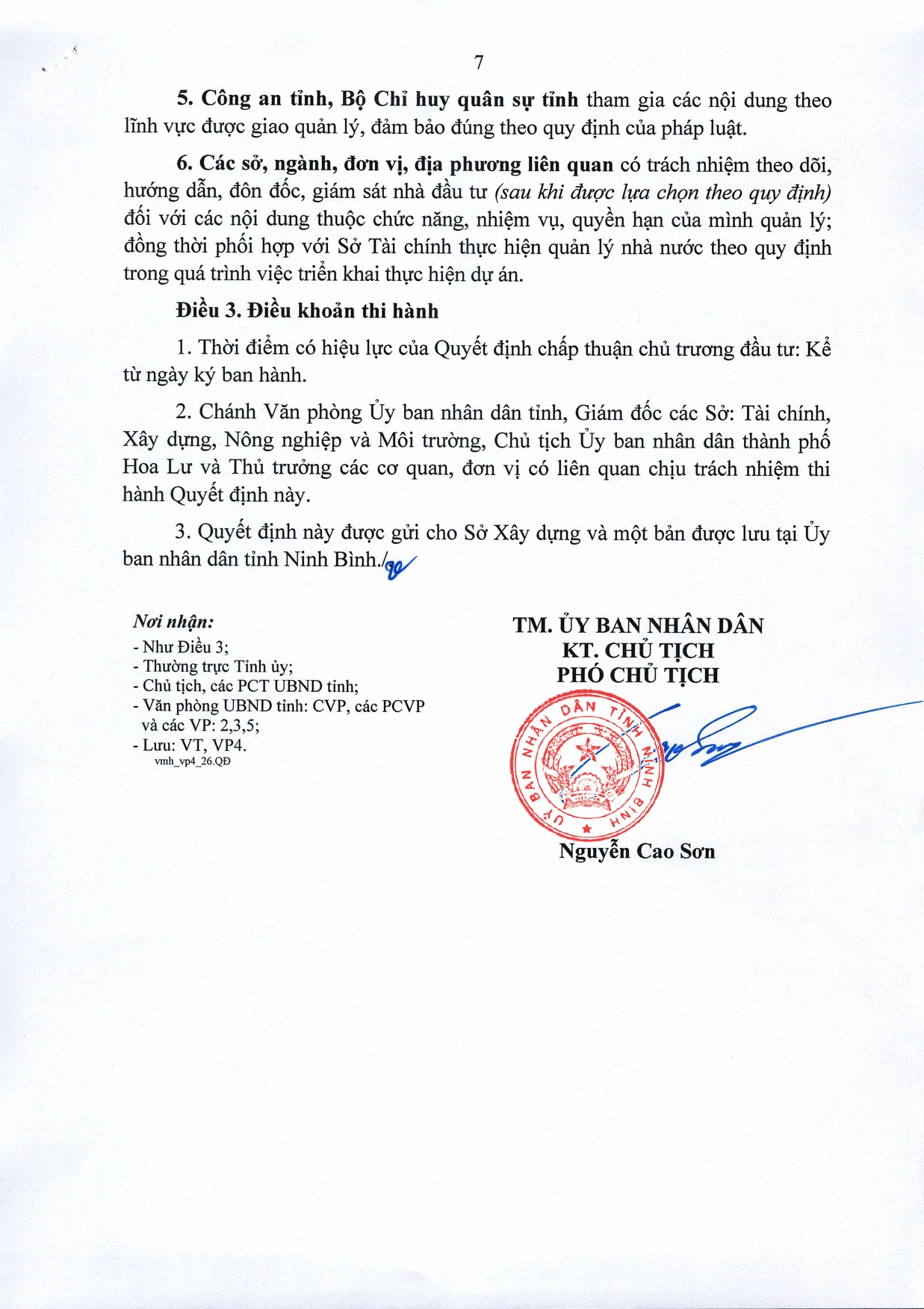Quyết định có hiệu lực kể từ ngày ký. Chánh Văn phòng UBND tỉnh, Giám đốc các Sở và Chủ tịch UBND thành phố Hoa Lư chịu trách nhiệm thi hành.