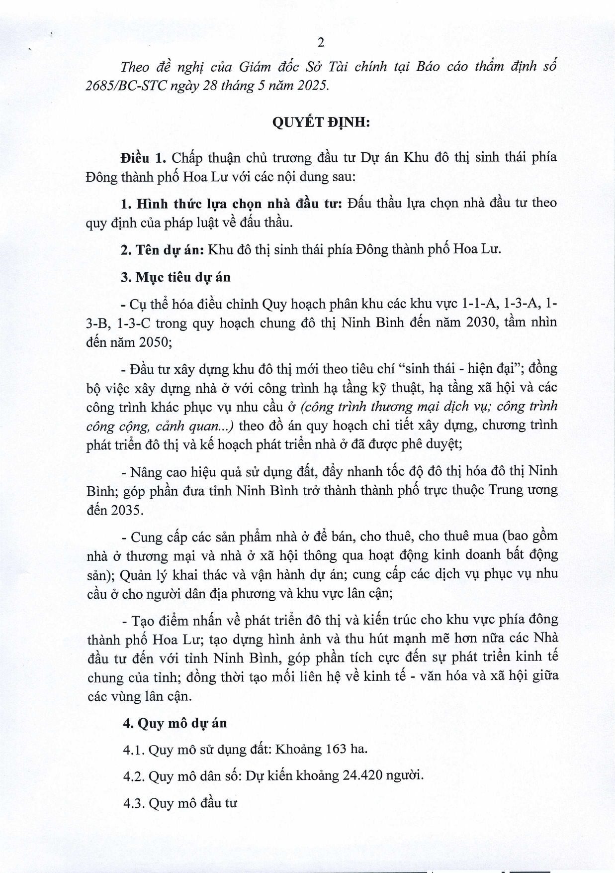 Ngày 29/5/2025, Ủy ban nhân dân tỉnh Ninh Bình đưa ra quyết định số: 505/QĐ-UBND, chấp thuận chủ trương đầu tư đối với dự án Khu đô thị sinh thái phía đông thành phố Hoa Lư (Eco Hoa Lư)