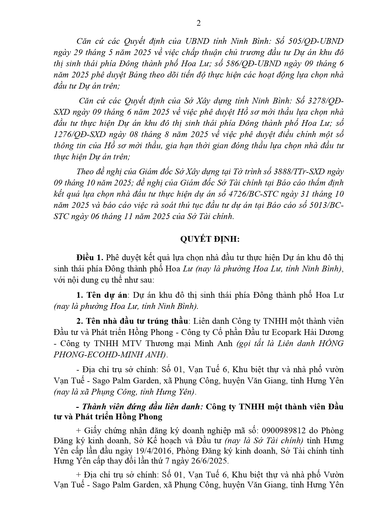 Ngày 7/11/2025, Ủy ban nhân dân tỉnh Ninh Bình đưa ra quyết định số: 1360/QĐ-UBND, phê duyệt nhà đầu tư thực hiện dự án Khu đô thị sinh thái phía đông thành phố Hoa Lư (Eco Hoa Lư)